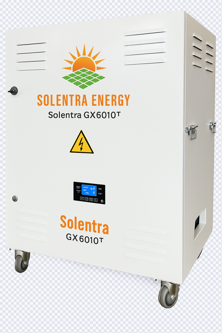 The Solentra GX6010™ is a compact indoor power system featuring 6,010Wh of UL 1973-certified LiFePO₄ storage and a 5,000W pure sine inverter. Designed for backup power, telecom, and mobile workspaces, it offers multiple AC outputs, smart LCD diagnostics, and smooth mobility with a rolling base. Solar and AC charge-ready for dependable, mission-critical performance.